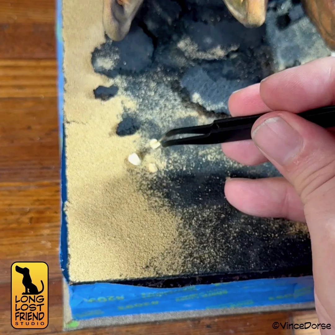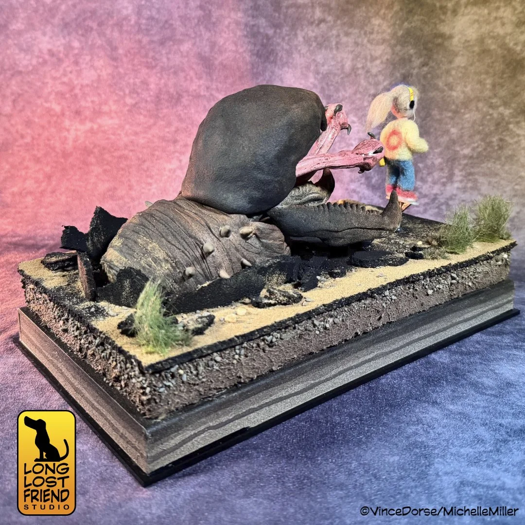 I worked on the clay Graboid, while Michelle needle felted the tiny little girl on the pogo stick. The desert road base is a group effort made of foam, cork, sand, and a football display case that would’ve otherwise gone to waste because, honestly, why in the world would I own a football.