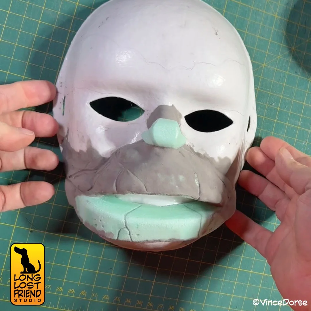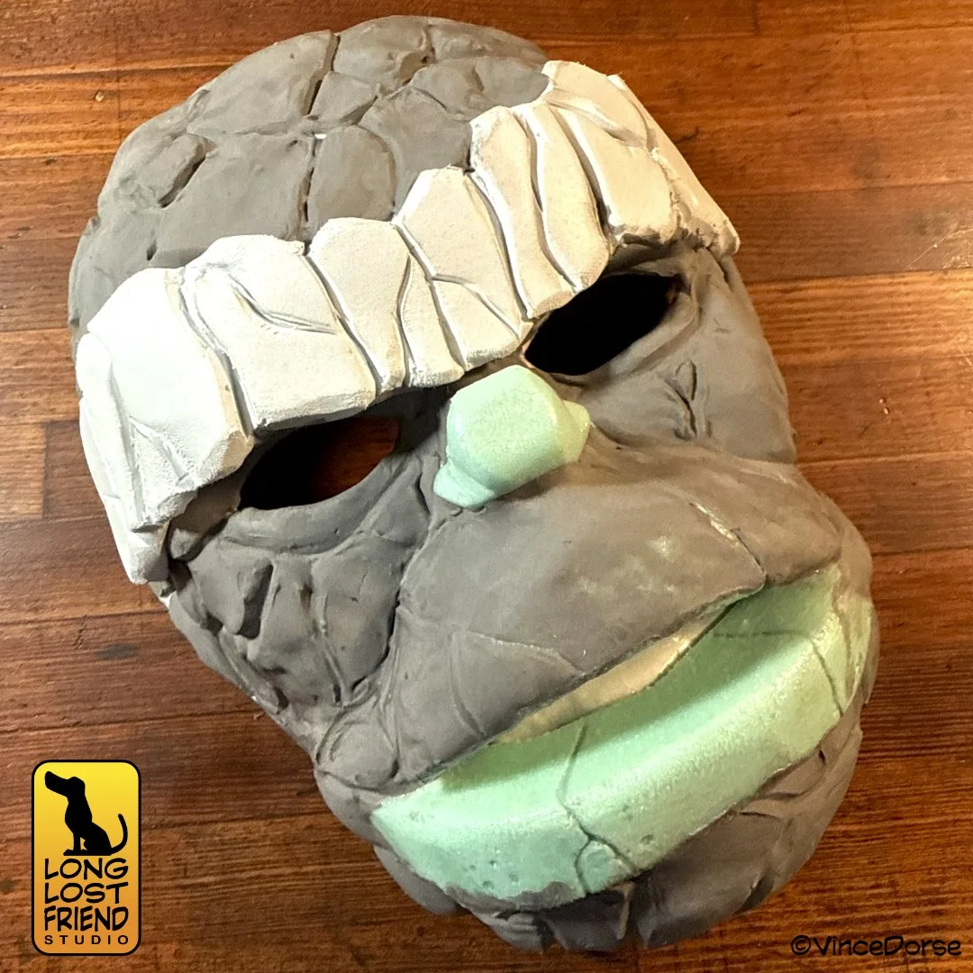 Beyond that, the XPS foam needs to be attached with some sort of adhesive. Hot glue seems the easiest, but that would also require us to carve out every single rocky plate, fit them to the face (and to each other, since they interlock) and cake the mask in glue. Not a process I was looking forward to.