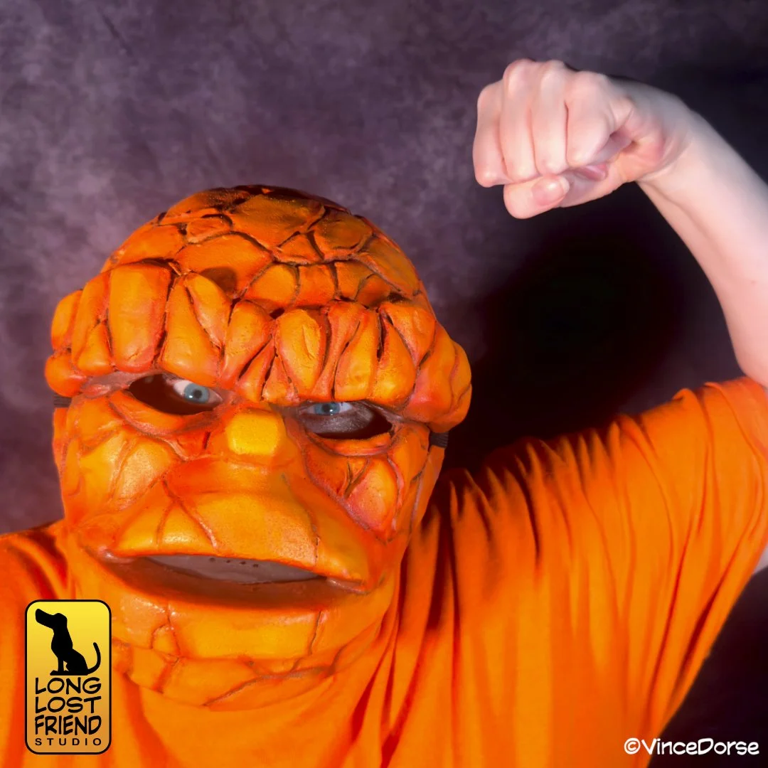 The Fantastic Four movie hits theatres this week. If you’ve seen the trailer, maybe you’ve noticed the scene where some middle-school kids are out and about wearing Ben Grimm Thing masks. They’re modeled after the vintage masks Ben Cooper, Inc. put out in the 1960s. When we saw that movie clip, Michelle and I knew we’d have to try to make our own version of the mask.